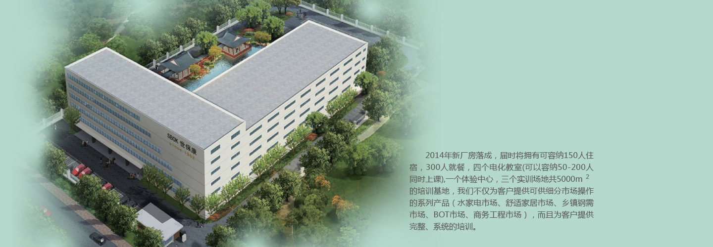 世??倒S,屆時擁有可容納150人住宿,300人就餐,四個電化教室(可以容納50-200人同時上課),一個體驗中心,三個實訓(xùn)場地共5000m 的培訓(xùn)基地,我們不僅為客戶提供可供細(xì)分市場操作的系列產(chǎn)品(水家電市場、舒適家居市場、鄉(xiāng)鎮(zhèn)剛需市場、BOT市場、商務(wù)工程市場),而且為客戶提供完整、系統(tǒng)的培訓(xùn)。