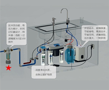世??导矣脙羲鳎话闶前惭b在廚房的水池下面、放在水池邊的臺(tái)面上、有的如果不想在水槽上打孔掛的可以用龍頭吊片掛在墻壁上,凈水器一般以超濾和微滲透為主。
