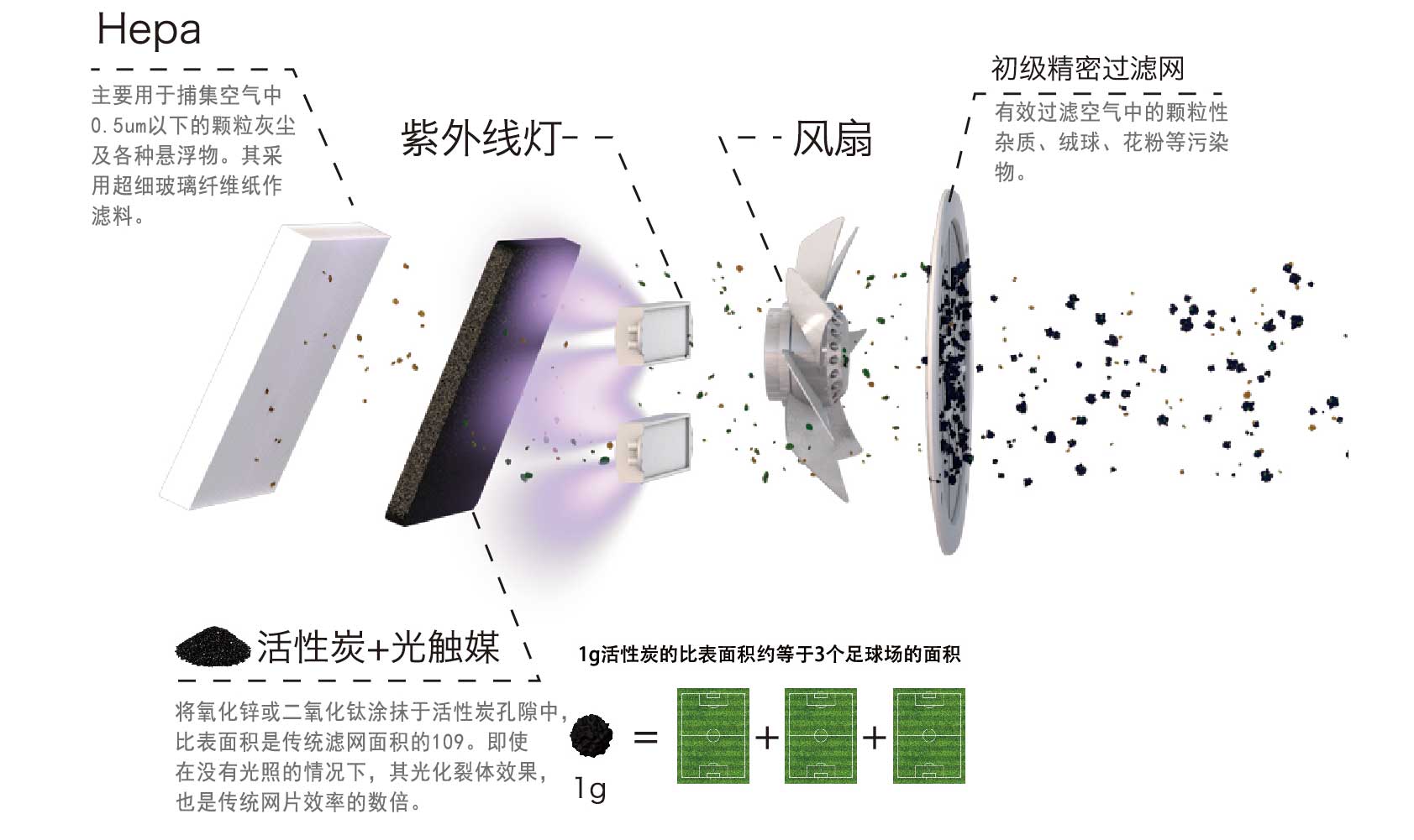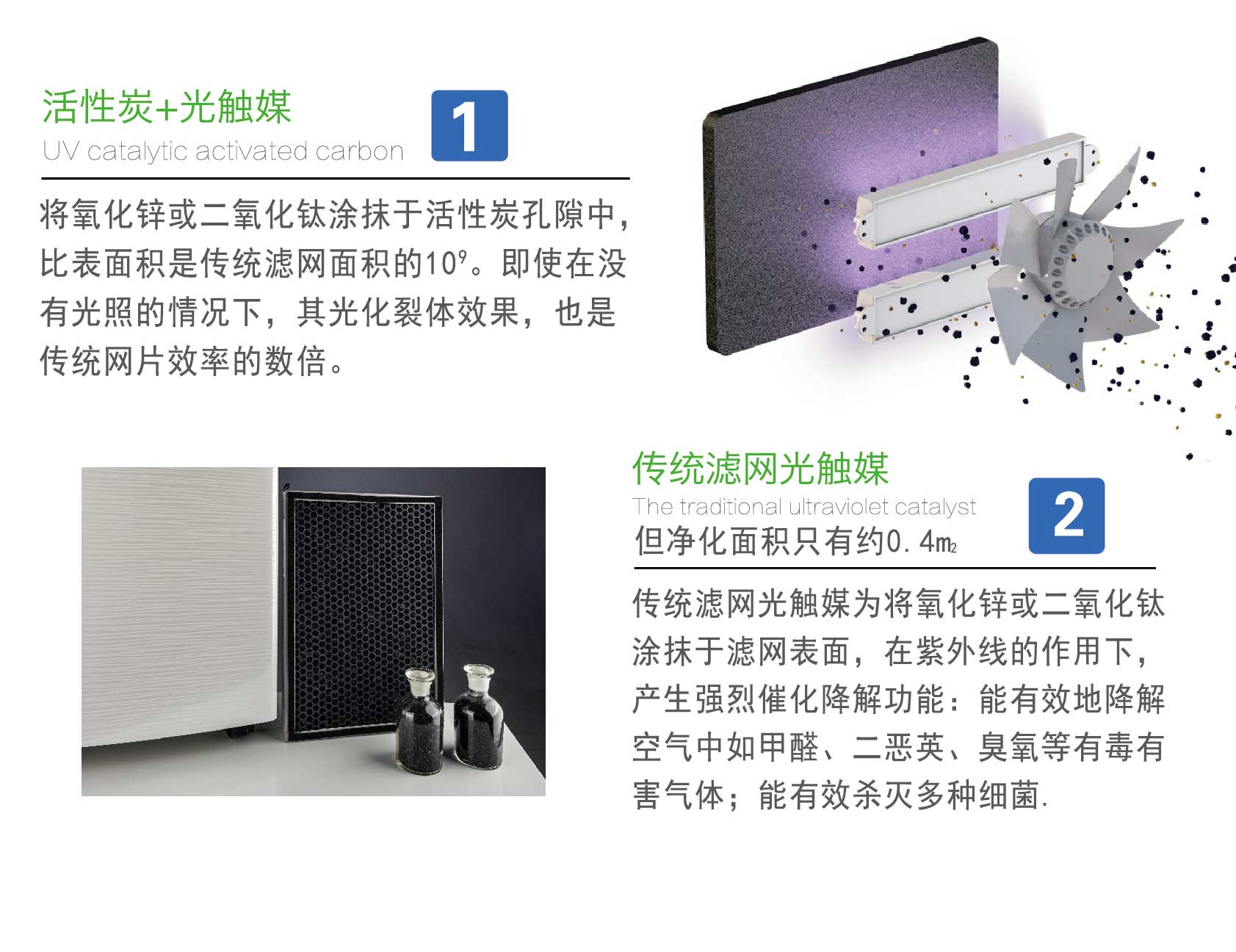 全觸媒空氣凈化系統(tǒng)——采用活性炭+光觸媒技術(shù),將氧化鋅或二氧化鈦載于活性炭空隙中,光觸媒和空氣的接觸面積是傳統(tǒng)濾網(wǎng)面積的數(shù)十萬倍,即使在沒有光照的情況下,其光催化裂化效果也是傳統(tǒng)光觸媒網(wǎng)片效率的數(shù)十倍。